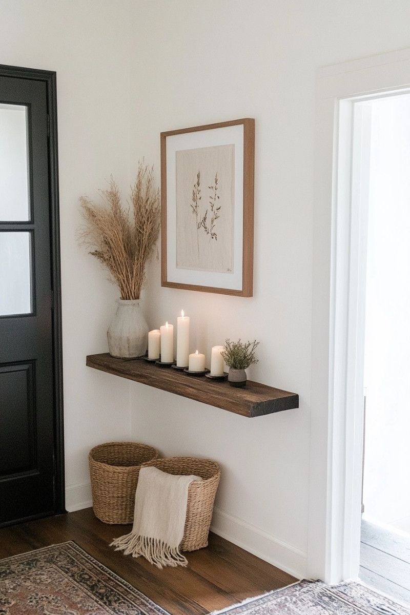 A simple wood shelf doubles as decor and drop zone for keys and mail. Add candles, a vase, and framed art for an instant calm welcome.