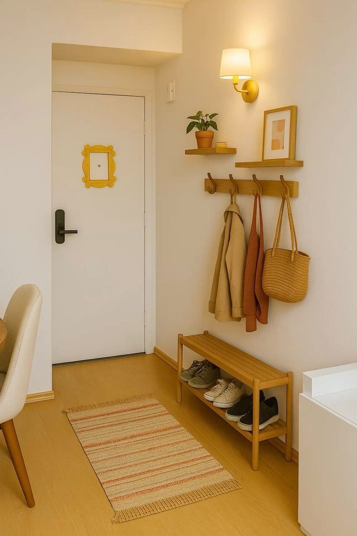 A slim bench offers a perch for shoes and bags while hooks handle coats. Warm wood tones keep the entry cozy and inviting.