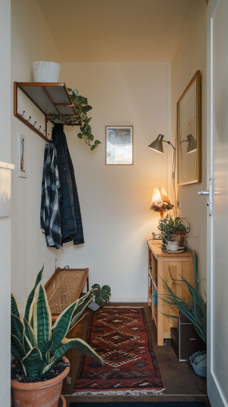 Plants, a patterned runner, and warm wood make a tiny entry feel lived-in. Hooks take care of jackets while the bench handles bags and quick shoe changes.
