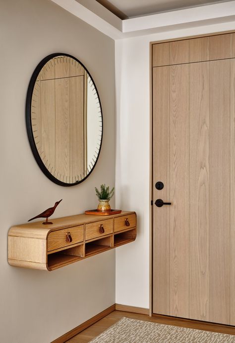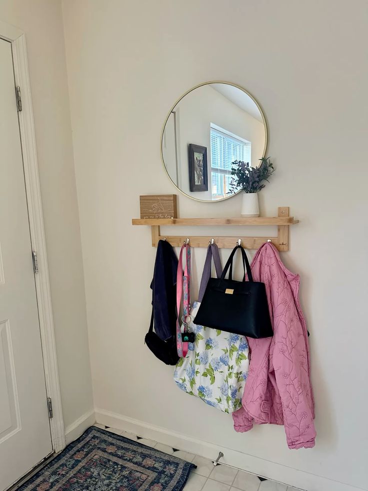 A round mirror opens up the space and the tiny shelf holds sunglasses, keys, or mail. Clean, compact, and super practical for micro-entries.