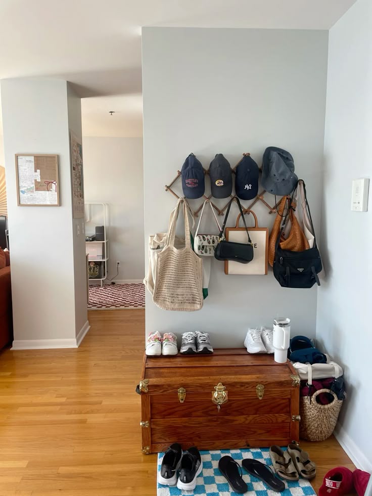 A vintage trunk works as a drop zone and hidden storage in one. The wall rack above handles hats and bags without eating floor space.