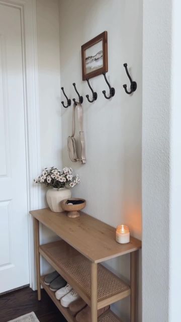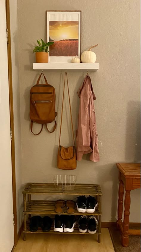 A simple wall shelf displays art and plants while a compact shoe rack keeps floors clear. Add hooks below the shelf for coats and bags.