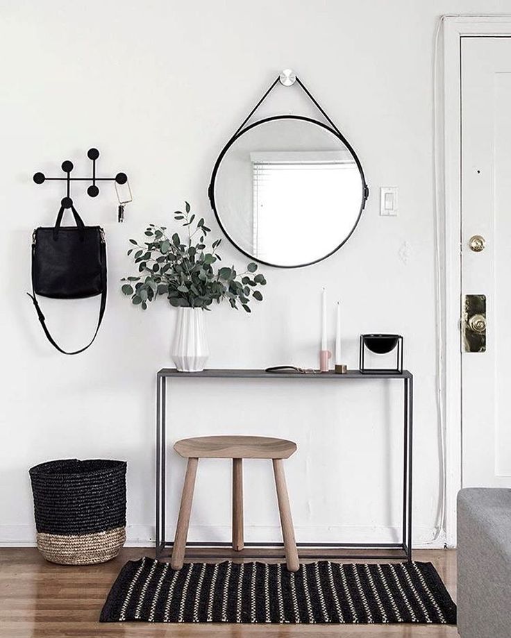 A round mirror, slim console, and woven basket keep things streamlined. Everything has a purpose yet still looks styled and modern.