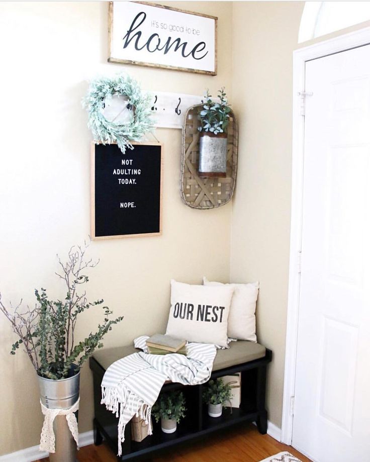 A cushioned bench, wall hooks, cute signage, and greenery warm up an unused corner. It’s practical, cozy, and personal in a small space.