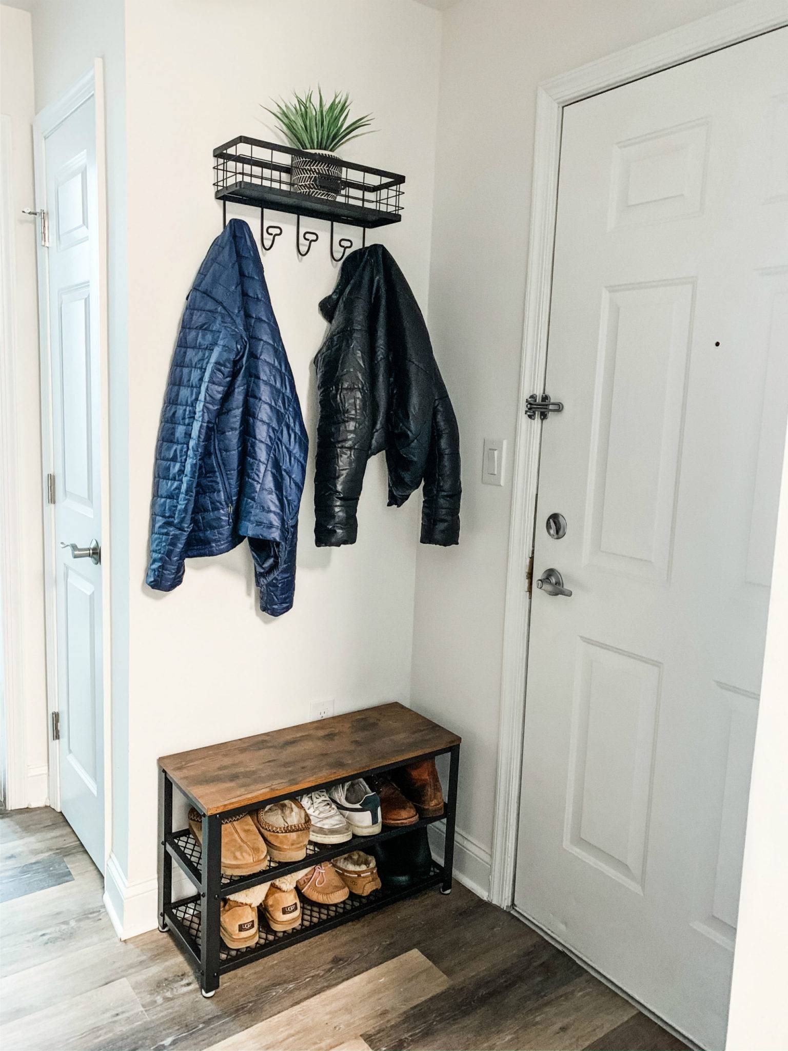 A compact metal rack holds coats, hats, and shoes without jutting out. Open shelving keeps everything easy to grab on the way out.