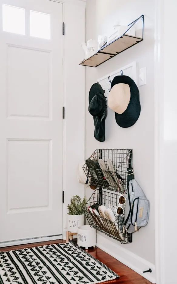 Wire racks hold shoes, mail, hats, and crossbody bags without using floor space. Ideal when there’s zero room for furniture.