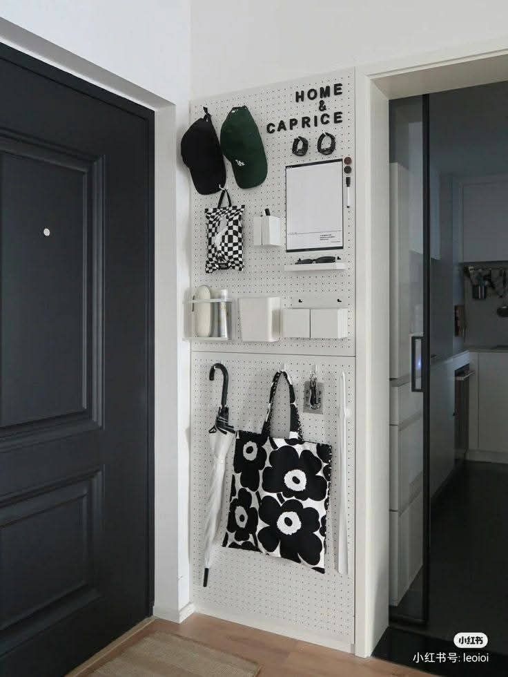 A pegboard corrals keys, hats, umbrellas, and notes in one tidy spot. It’s renter-friendly and easy to reconfigure as your needs change.