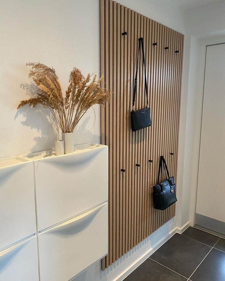 A wood slat panel turns storage into decor, with hooks that blend in. It stays sleek even when loaded with bags.