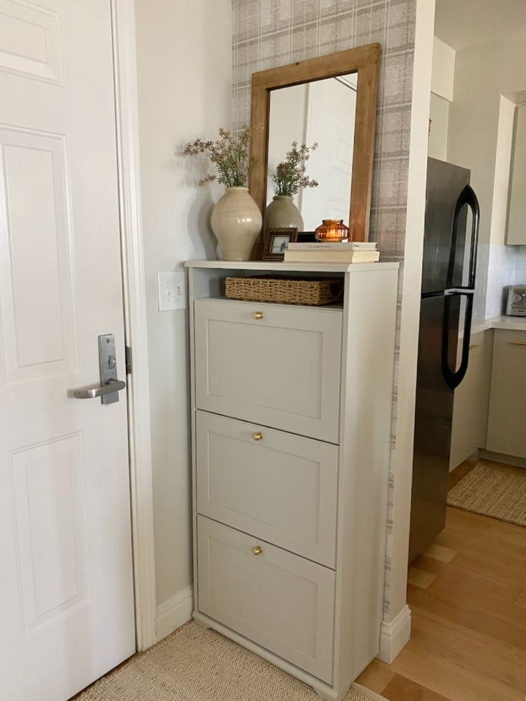A tall, slim shoe cabinet maximizes vertical space without overwhelming the room. A mirror above keeps things airy and homey.