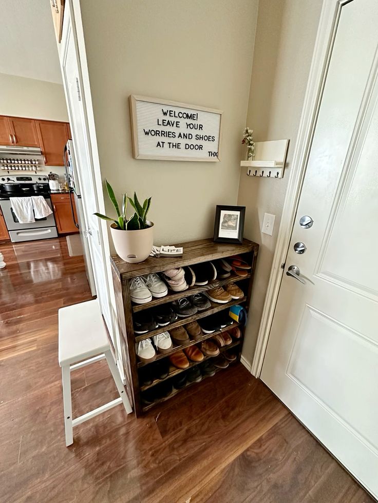 A labeled message board and shoe shelf set the tone—shoes off, good vibes on. Friendly, functional, and easy to maintain.