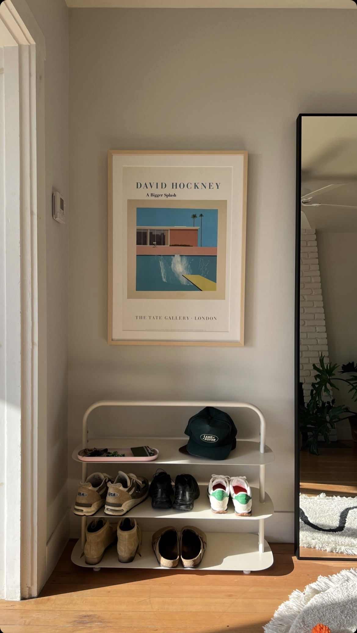 A framed print above a clean-lined shoe rack gives a gallery feel. Practical storage meets polished style in a tiny footprint.