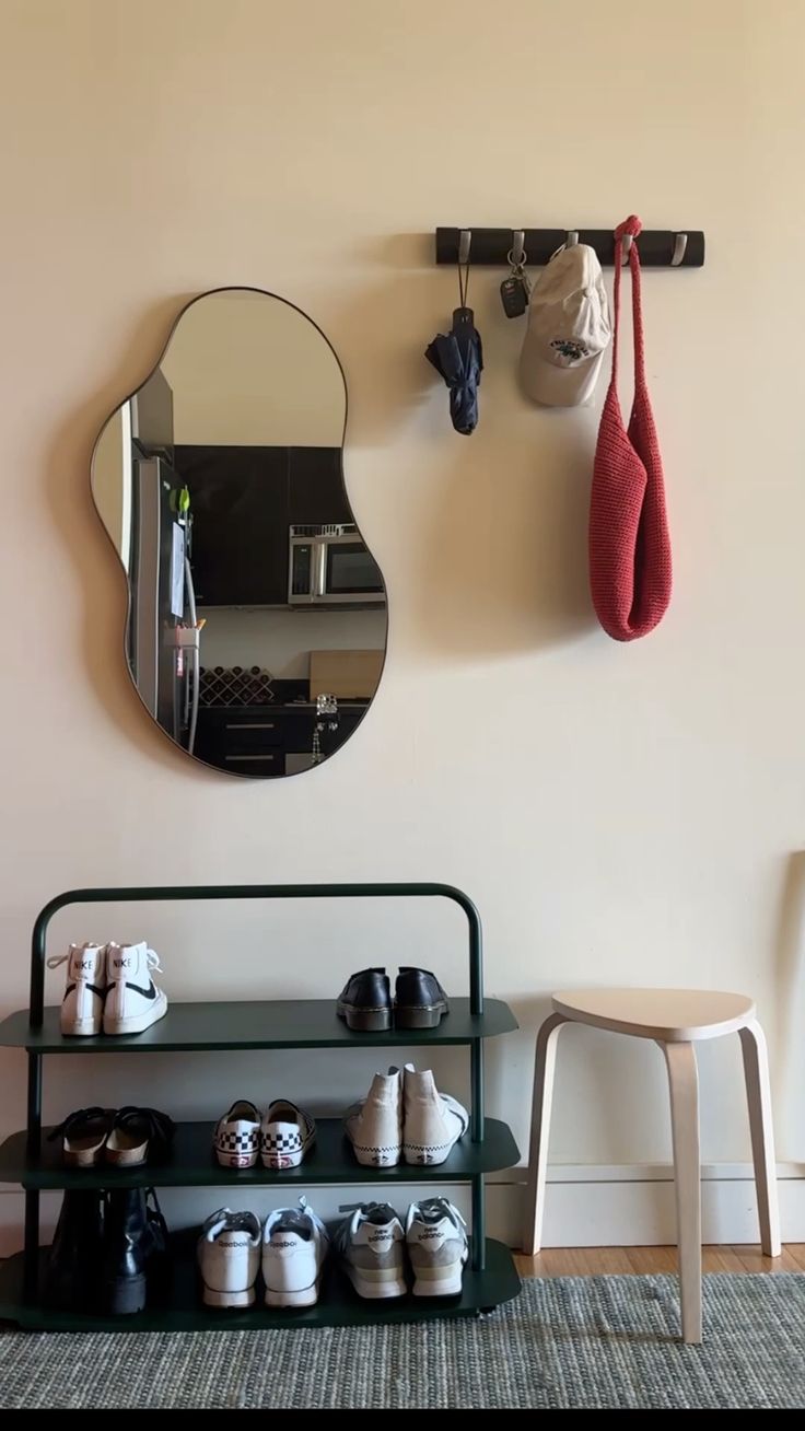 A wavy mirror adds personality while wall hooks keep daily items handy. It’s playful yet super useful in tight spaces.