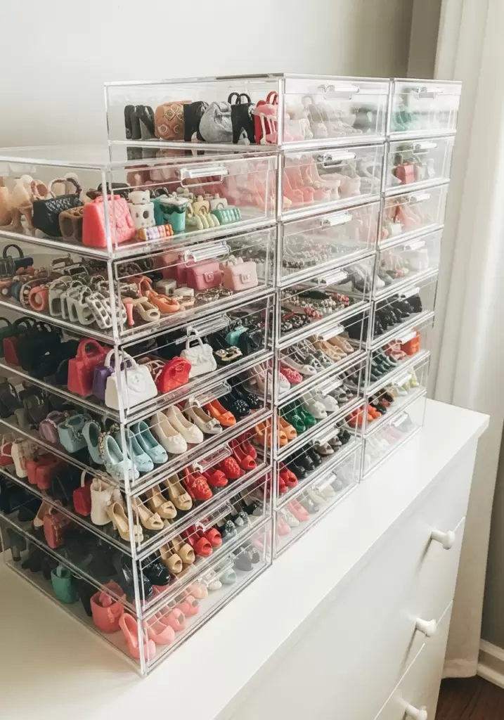 These drawers look sleek and expensive, but they are totally budget-friendly. Use them on a dresser or desk to keep tiny accessories like shoes and bags visible and dust-free. Group items by color or doll set.