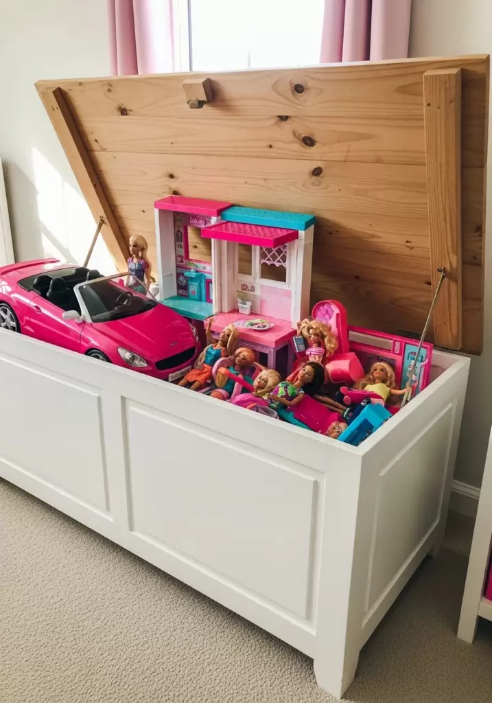 Sometimes, you just need a big box to toss things into quickly. A wooden toy chest with a slow-closing lid is a great option for bulk storage of houses, cars, or large accessories. It’s timeless furniture that hides everything.