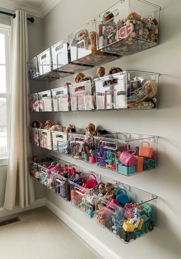 If floor space is tight, try mounting clear plastic bins directly onto the wall. These are great for keeping frequently used dolls or playset pieces right at eye level. They make cleanup a quick toss-in job.