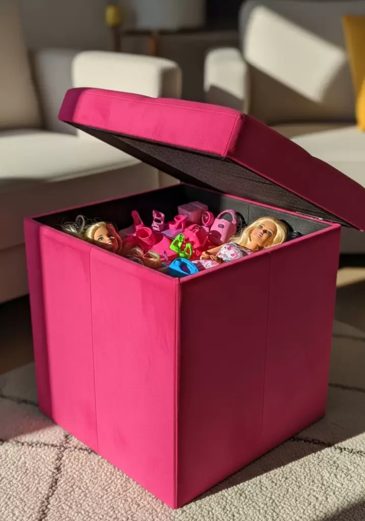 If you need hidden storage that doesn’t scream ‘toys,’ a storage ottoman is your friend. It provides seating and a secret spot for hiding dolls and accessories when company arrives. Choose a fun color like velvet pink or hot pink vinyl.