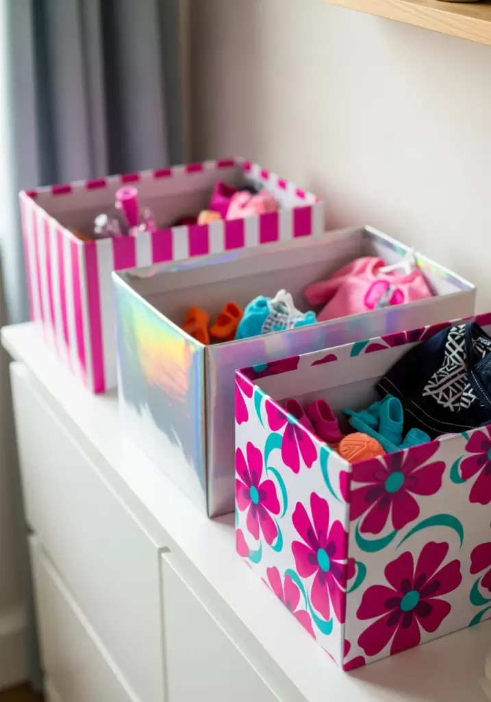 Instead of tossing old shoe boxes, cover them in cute wrapping paper or contact paper. This is a free, fun DIY project that creates personalized storage containers for clothes or small accessories. They look much better than plain cardboard.