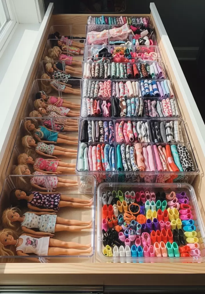 If you are dedicating a dresser drawer to Barbie storage, use adjustable plastic dividers. These create custom compartments for clothes, shoes, and dolls. It stops everything from becoming a giant, confusing pile in the middle of the drawer.