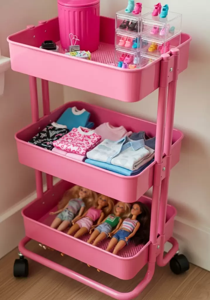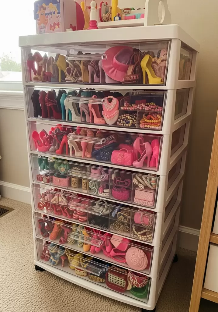 Barbie comes with tiny shoes, hats, and a million accessories that get lost fast. Use a clear, rolling plastic drawer unit to keep everything sorted by category. This hack makes cleanup easy and prevents pink chaos.