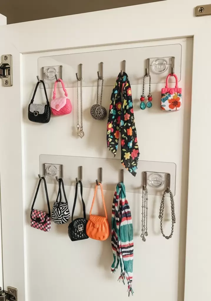 Sometimes the easiest solution is the best. Small, self-adhesive wall hooks are great for hanging doll purses, scarves, or light accessories directly on the wall or inside a cabinet door. They are cheap and require no tools.