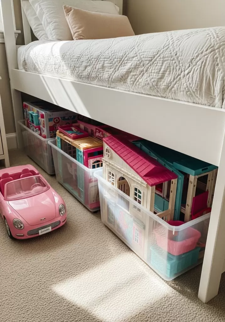 When you have massive playsets (cars, houses, pools) that you need to hide, use shallow bins that slide right under the bed. This is prime real estate that often goes unused. It keeps big items accessible but out of sight.