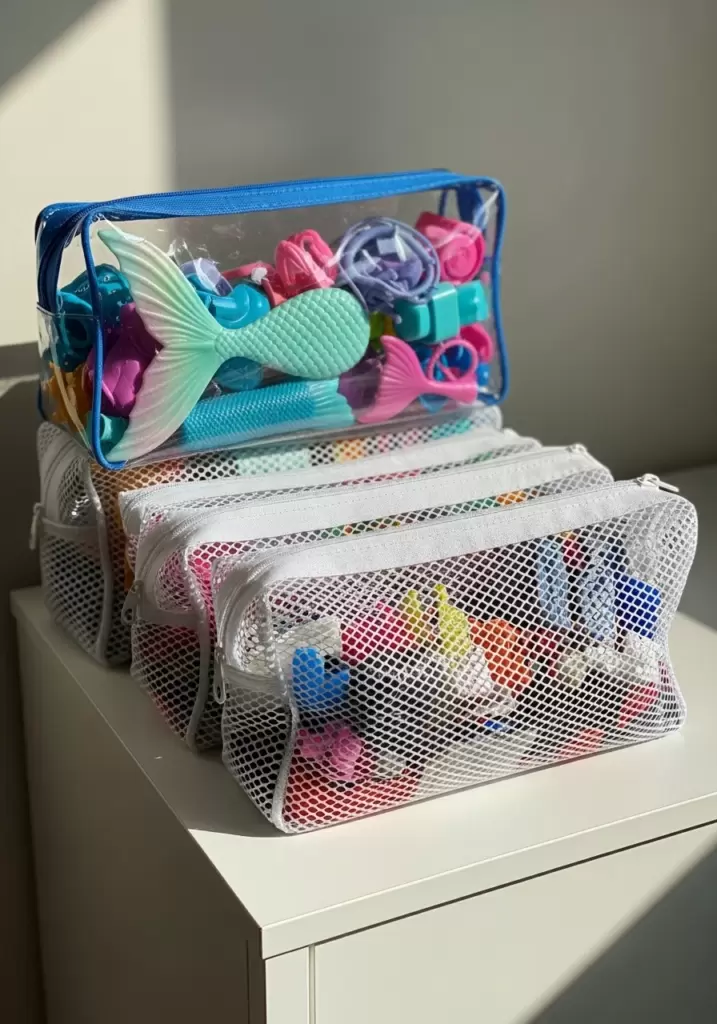 Clear vinyl or mesh zipper pouches are perfect for keeping related items together. Maybe one bag holds all the mermaid gear, and another holds all the career clothes. They are cheap, stack well, and keep small items contained.