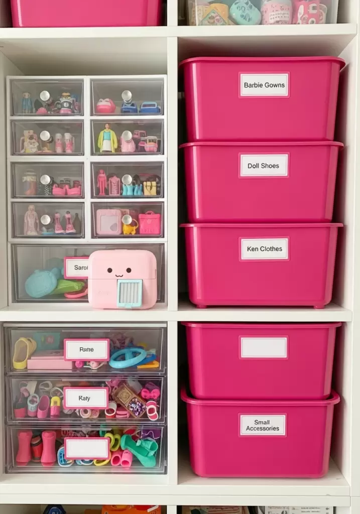 - Group bins by color or doll category.