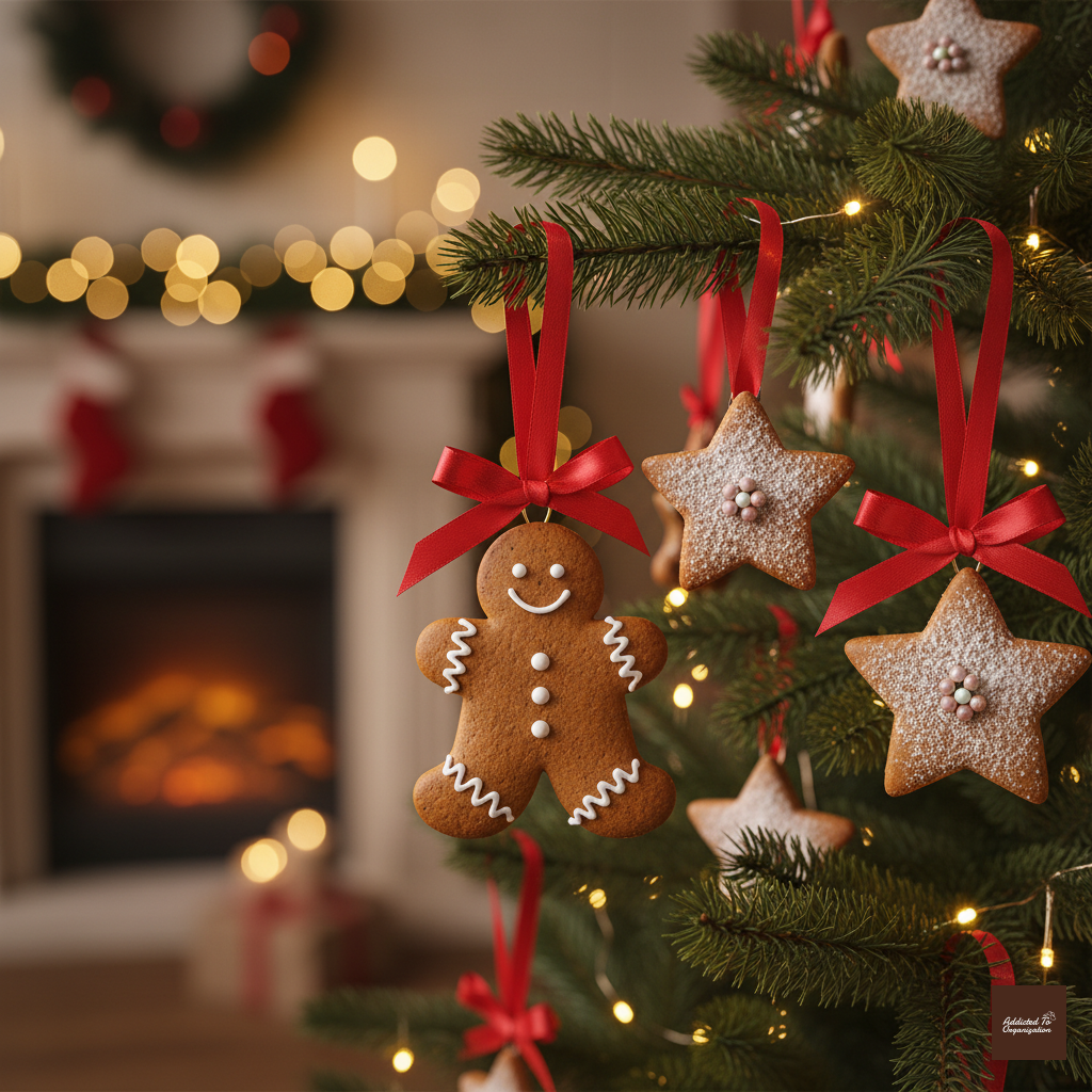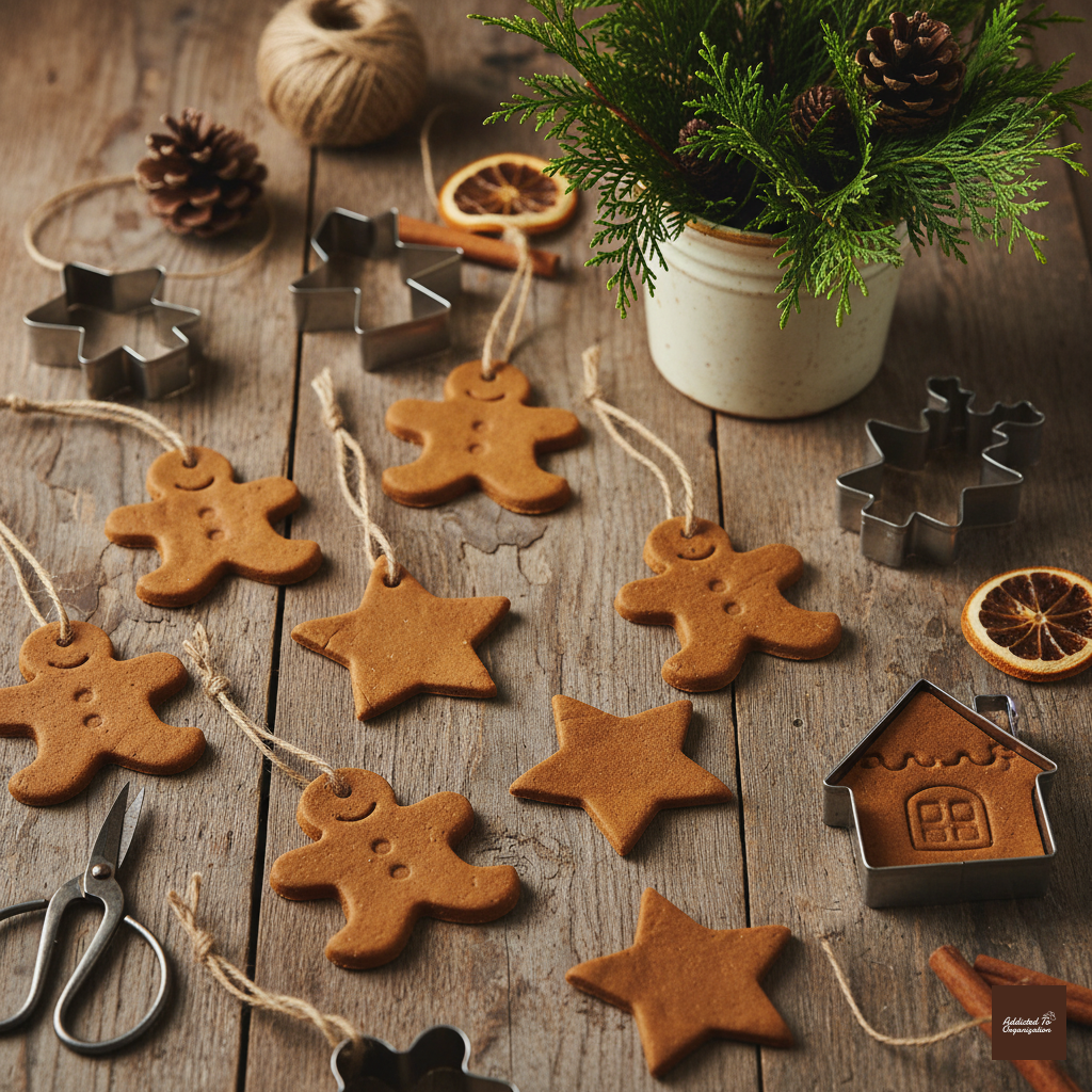 Make ornaments with a mixture of ground cinnamon, applesauce, and white craft glue. Knead the ingredients until they form a clay-like dough. Roll it out, cut shapes using cookie cutters, and poke a hole for hanging. Allow them to air-dry completely (this can take 2-3 days). They will harden and smell like gingerbread without the spoilage.