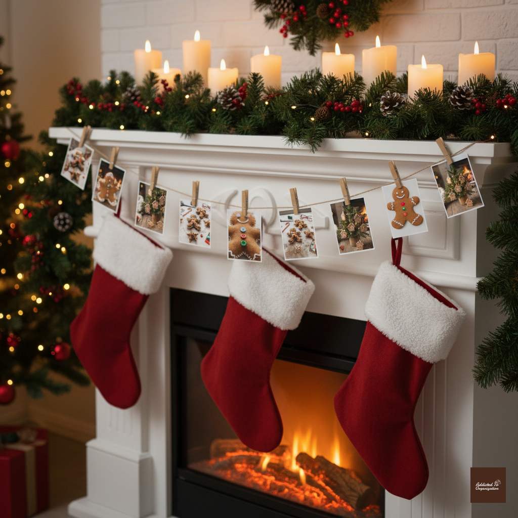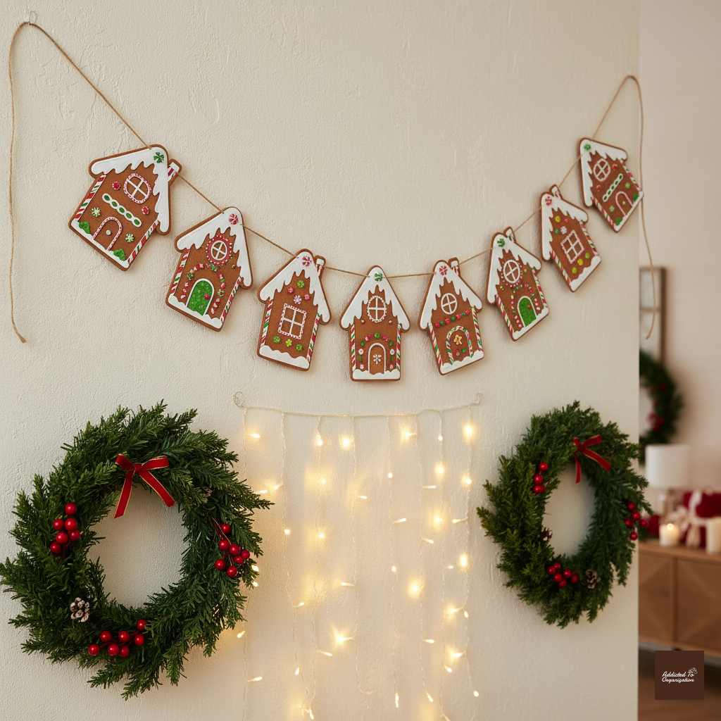 Create 5-7 different stylized gingerbread houses cut from sturdy cardstock or foam board. Add details like window cutouts, chimney shapes, and colorful candy details made from paint or glued-on buttons. Punch holes at the top corners and string them onto a long length of twine to hang across a mantel or shelf.