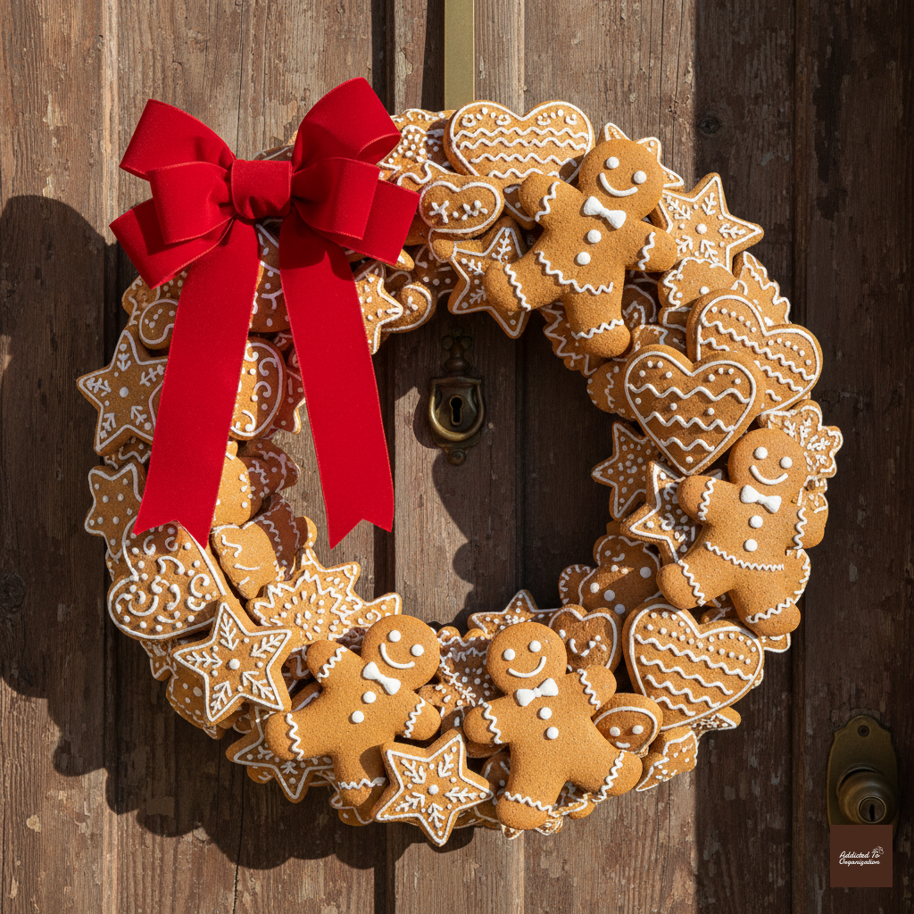 Purchase a simple foam wreath base (about 12 inches). Using a hot glue gun, glue faux gingerbread cookies (salt dough or clay work best) completely around the foam base. Ensure there are no large gaps. Finish the wreath with a large, bright red burlap or velvet bow at the top or bottom.