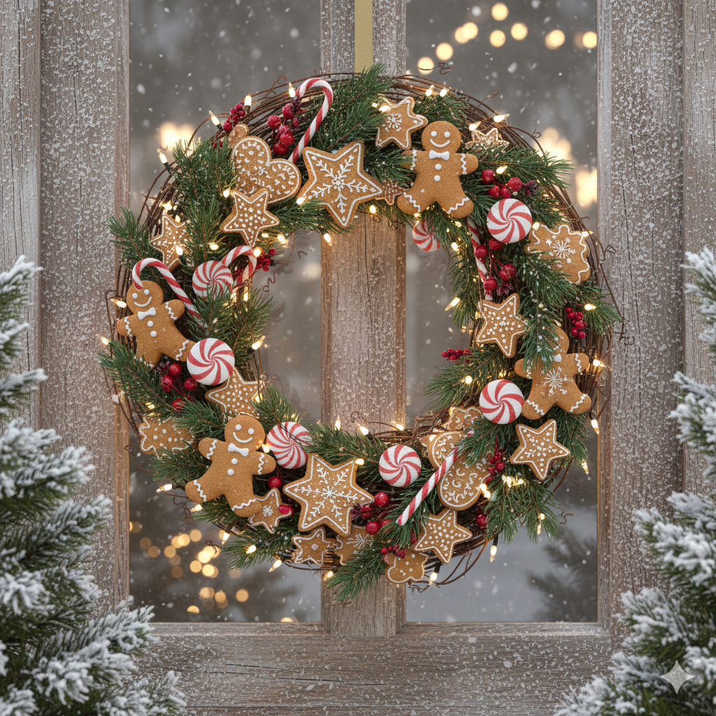 Start with a natural grapevine wreath. Combine faux gingerbread cookies (store-bought or DIY) with candy cane stripes (either faux, plastic, or painted wooden pieces). Glue the pieces onto the grapevine base, scattering them evenly. Use red and white accents to tie the pieces together.