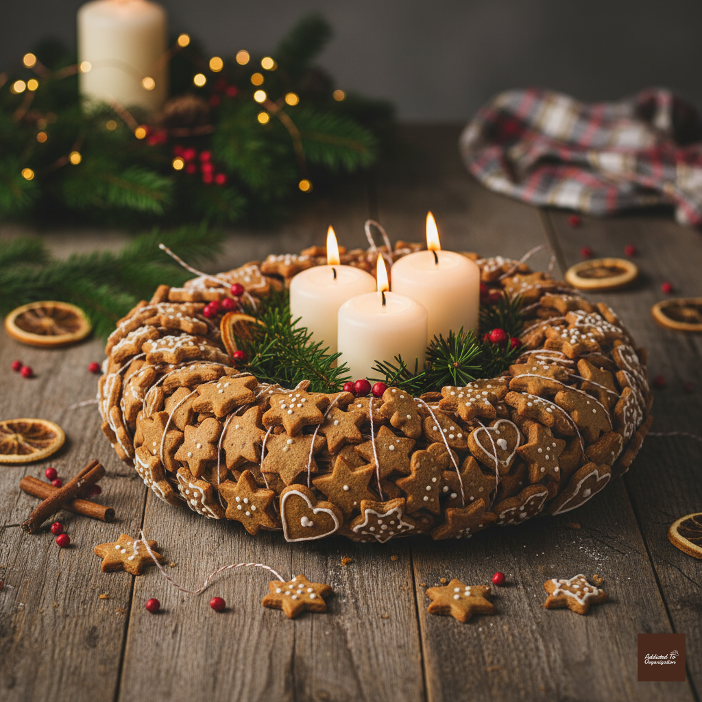 Bake dozens of mini gingerbread cookies (circles or stars). Let them cool. Thread the cooled cookies closely together onto a piece of thin floral wire, pushing them together tightly. Shape the wire into a small, sturdy wreath shape and secure the ends. Place it on a platter for a festive tabletop display.