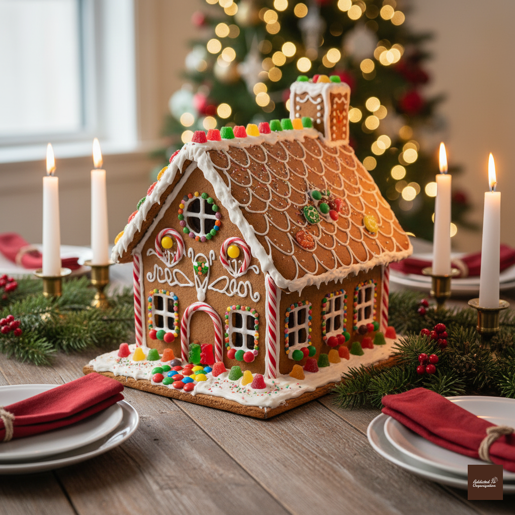 Create a large, sturdy gingerbread house structure using baked pieces or heavy cardboard (if it’s non-edible). Decorate the house lavishly with colorful candy details (licorice, gumdrops, peppermints) and tons of white icing (or paint/puffy paint). Place it on a platter surrounded by cotton ball “snow” for your holiday table.