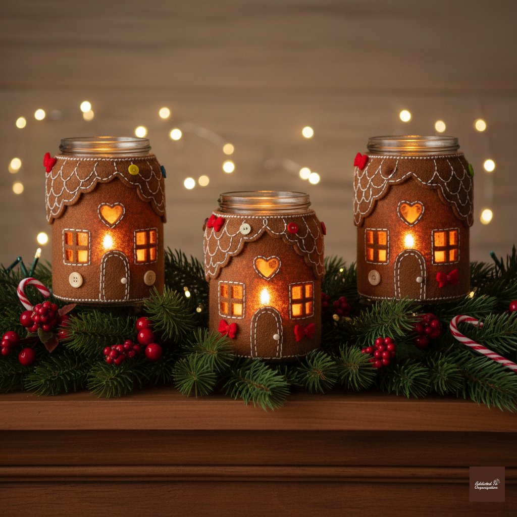 Wrap glass jars (like mason jars) in brown gingerbread-themed paper, felt, or even a sheet of plain brown paper. Carefully cut small window shapes (square or arched) into the material. Glue the material to the jar. Insert battery-operated tealights inside for a safe, glowing effect.