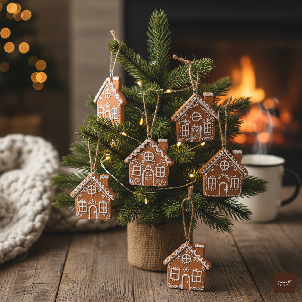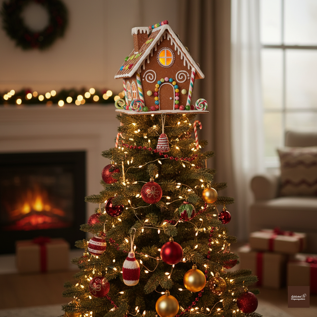 Give your tree a cozy roof! Instead of a traditional star or angel, crowning your tree with a tiny, perfect gingerbread house adds a whimsical, homey feel.