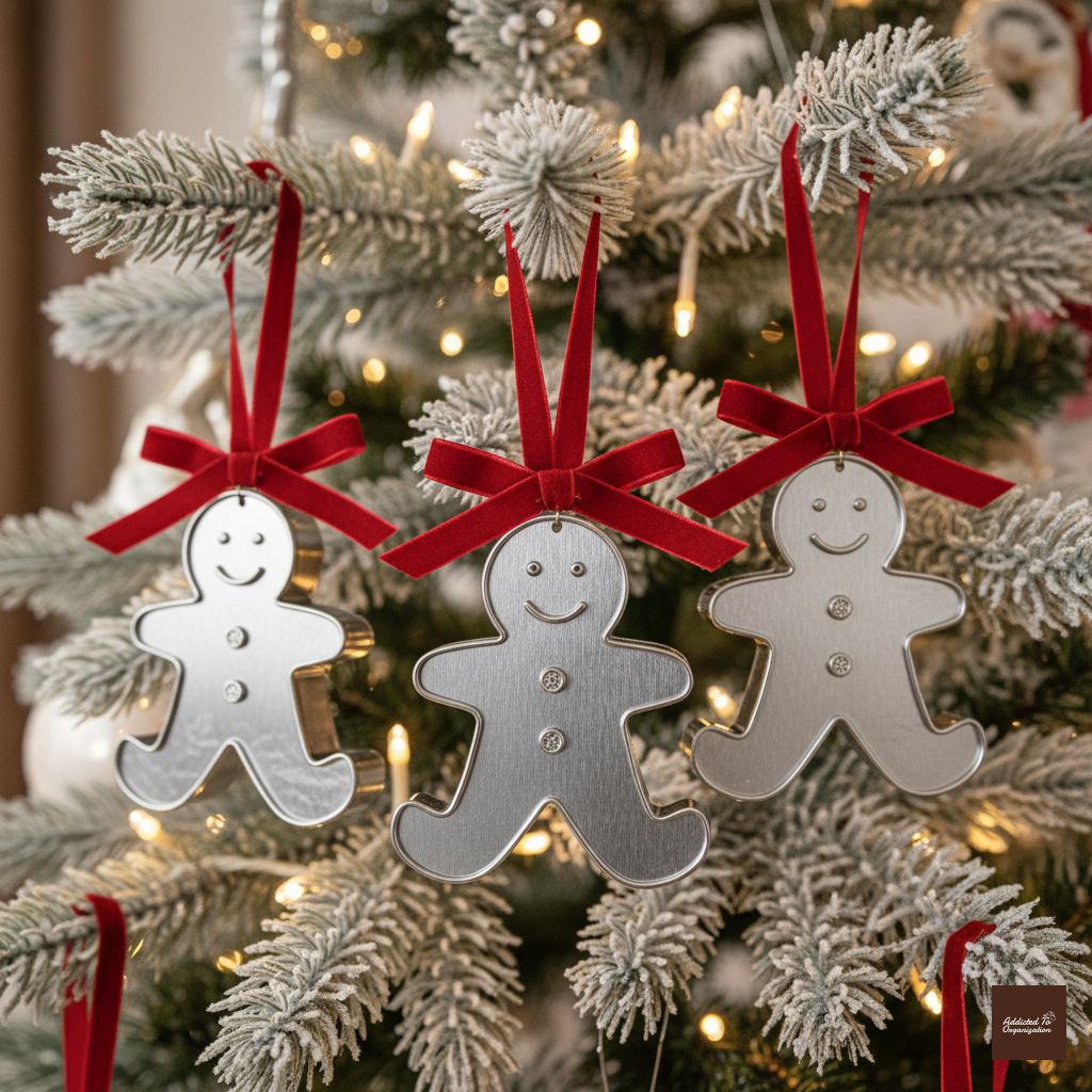 Find metal cookie cutters shaped like gingerbread men, stars, or trees. Simply tie ribbons or decorative twine to the top edge of the metal cookie cutters and hang them directly on the tree. You can also spray paint them gold or bronze for extra sparkle.