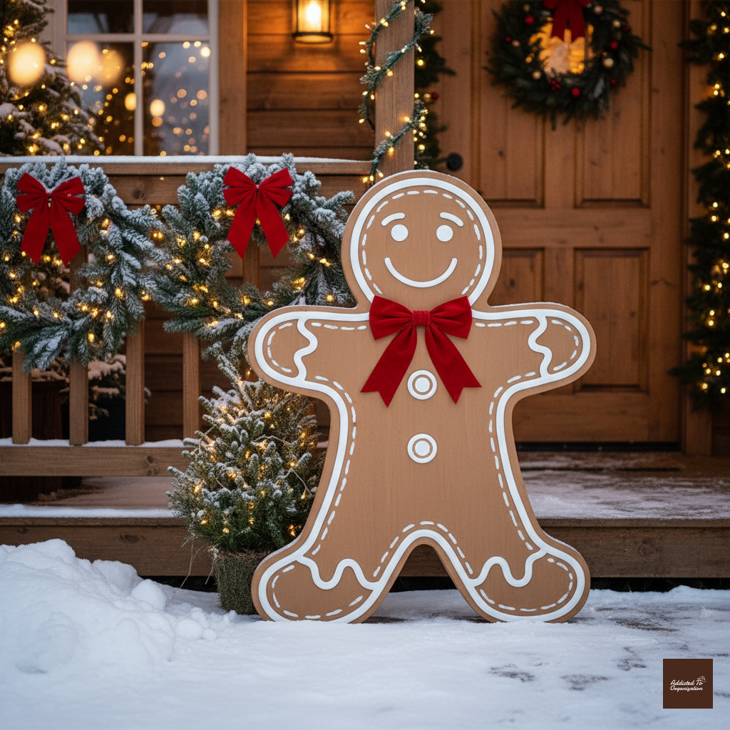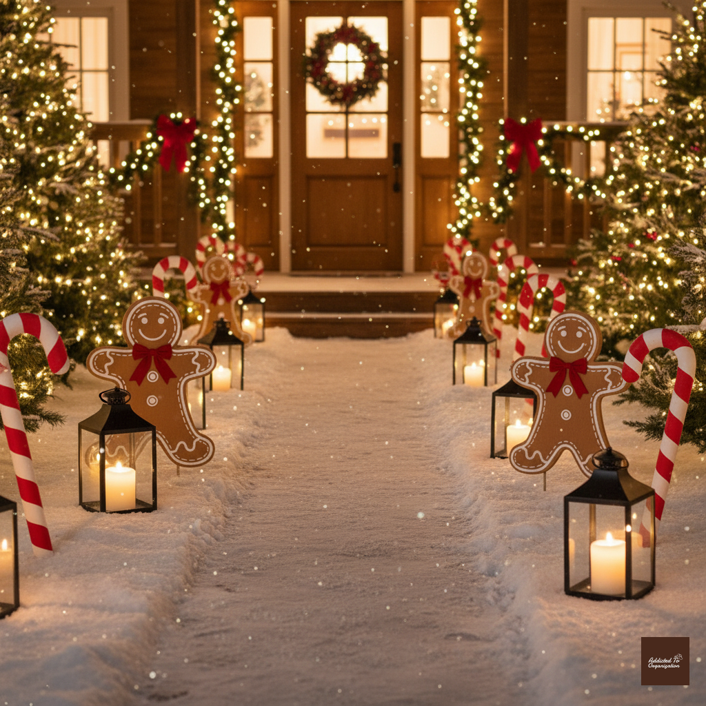 Attach faux, weatherproof gingerbread men (made from sealed wood or durable plastic) to short garden stakes. Line your walkway by placing the gingerbread stakes alongside other fun, exaggerated outdoor decor, like oversized lollipop cutouts or plastic candy canes, for a magical, sweet-themed entry.