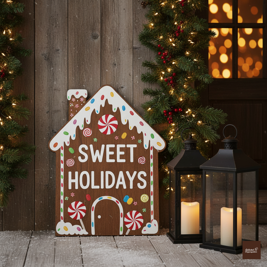 Get a long, vertical piece of wood. Cut the top into a slight peak, mimicking a house roof. Paint the whole piece brown. Use paint or vinyl letters to write festive wording like “Sweet Holidays” or “The Gingerbread Lane.” Decorate the top with painted candy details or “icing” to mimic a gingerbread house sign.