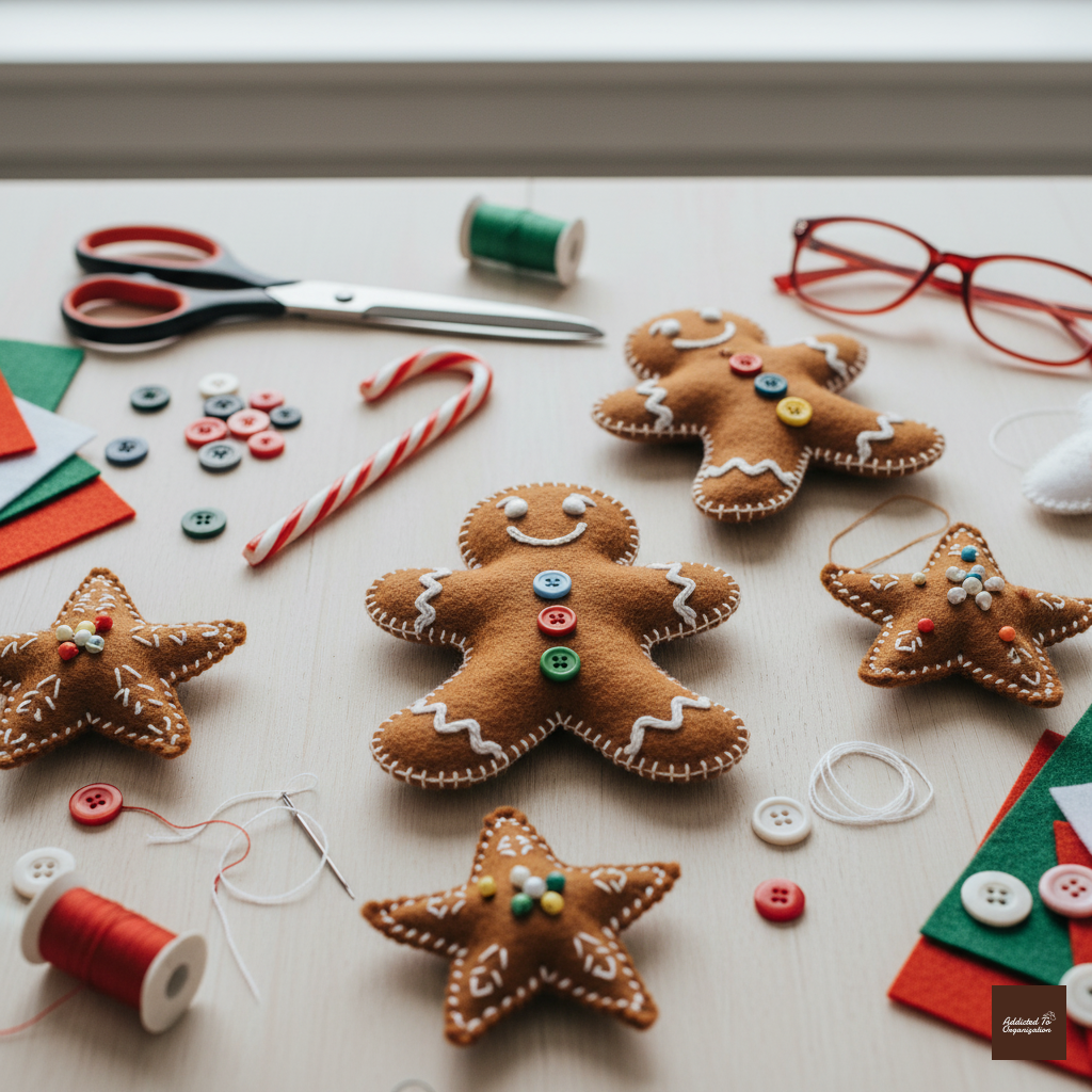 Cut simple gingerbread man shapes from brown felt. Use white puff paint or fine-line fabric paint to simulate the icing details around the edges and eyes. Add tiny, colorful buttons or sequin beads for extra charm. Attach a loop of string or ribbon for hanging.