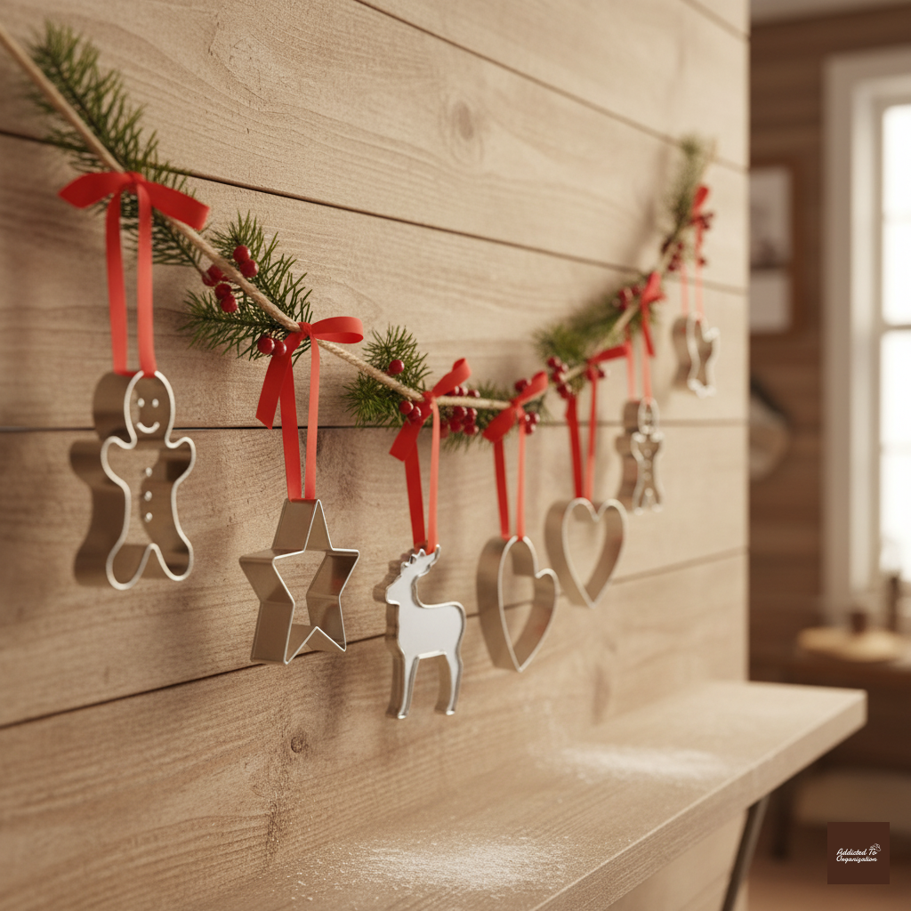 Gather a variety of gingerbread-shaped cookie cutters (men, stars, hearts). Wrap twine or jute through the top opening or handles of the cutters. Alternate the cutters with other lightweight, festive ornaments like faux candy cane stripes or small wooden beads.