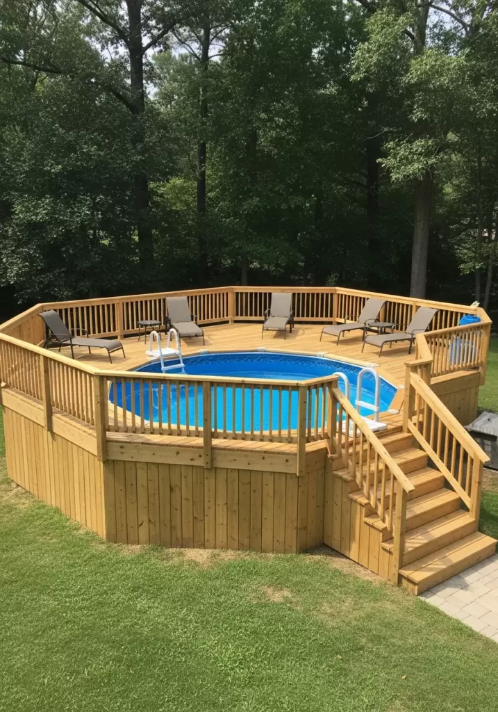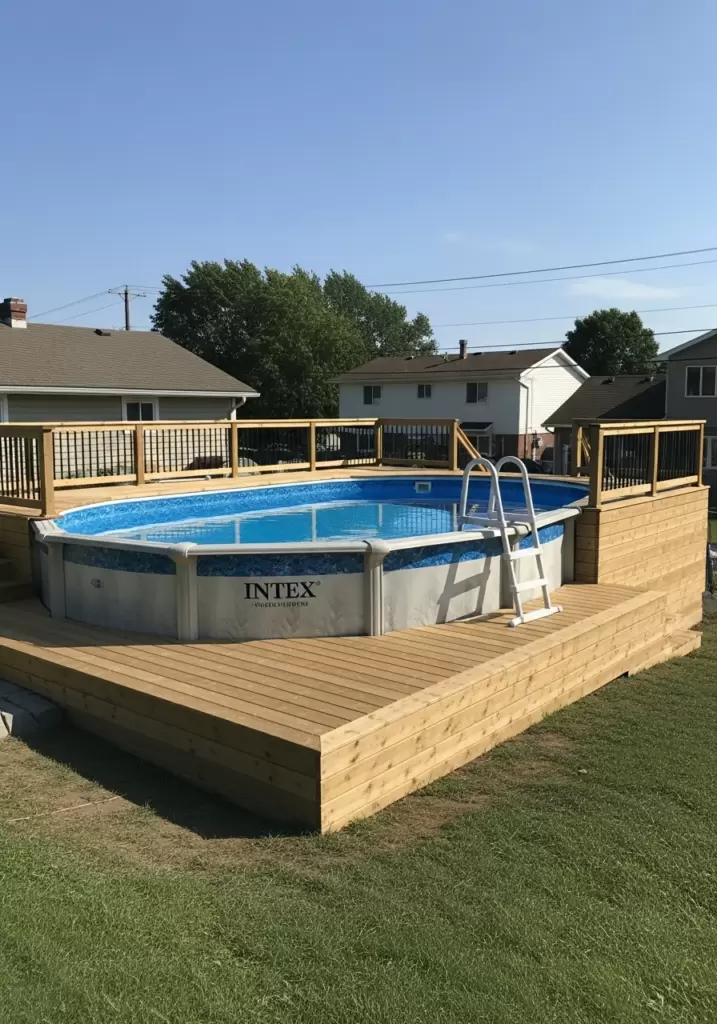 Imagine your Intex pool completely hidden by a beautiful wooden deck. This design makes your pool look like a permanent fixture, offering space for lounging and easy access. It’s a fantastic way to blend the pool into your backyard.
