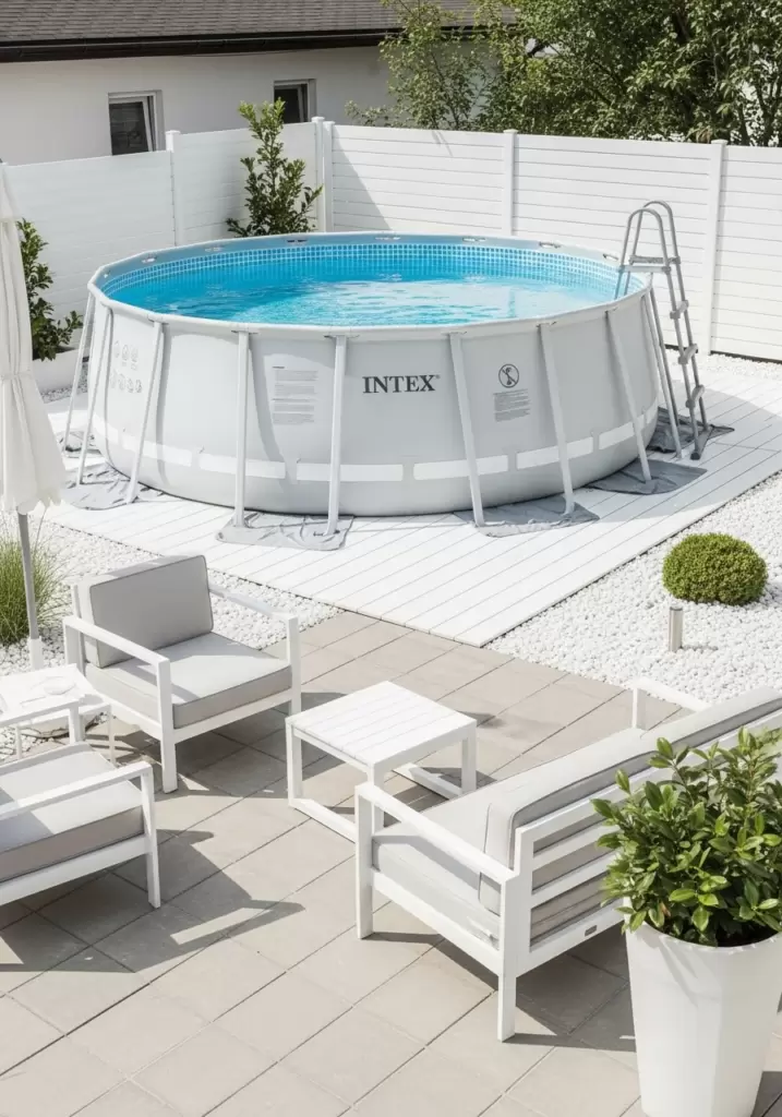 Embrace a clean, bright look with an all-white minimalist design around your Intex pool. Use white outdoor furniture, neutral cushions, and simple landscaping for a fresh, contemporary feel.