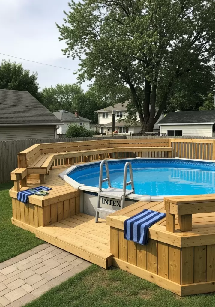 Design your pool deck to include built-in benches. This maximizes space, provides handy seating for guests, and makes your Intex pool area more functional and inviting.