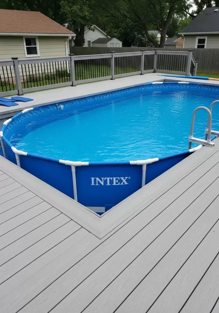 For a sleek, modern look, a gray composite deck around your Intex pool is a smart choice. Composite decking is low-maintenance and offers clean lines that give your backyard a contemporary edge.