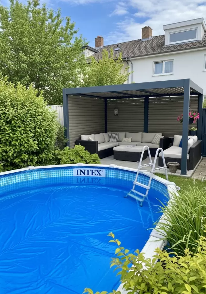 Even in a small backyard, you can create a stylish lounge. Install a pergola beside your Intex pool with comfortable seating to define a chic outdoor living zone.
