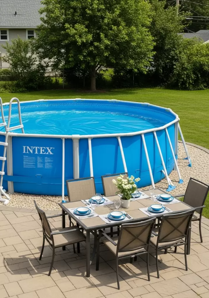 Make your Intex pool area feel like a mini resort by adding a small bar counter with stools and tropical decor. It’s perfect for serving drinks and snacks by the water.