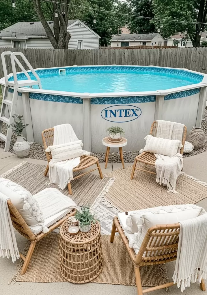 Give your Intex pool area a cozy, bohemian look with woven wicker furniture, neutral textiles, and layered outdoor rugs. This creates a relaxed and inviting atmosphere.
