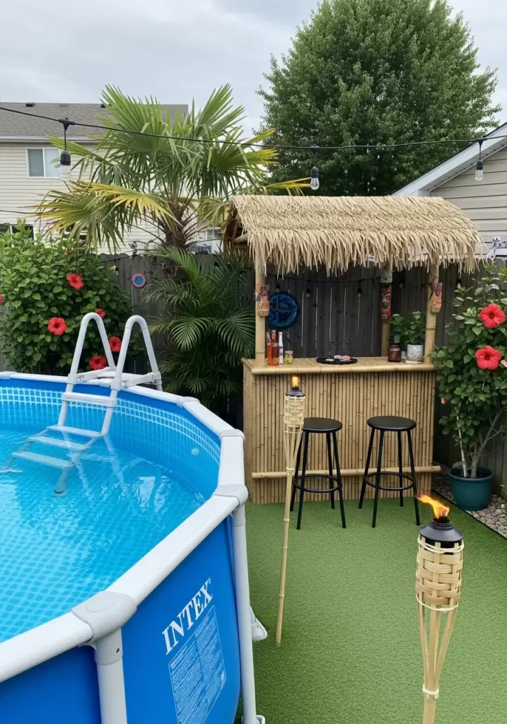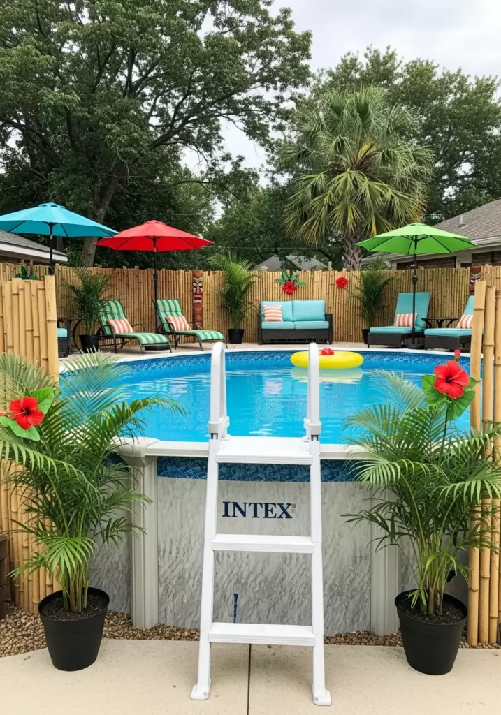 Turn your backyard into a vacation spot with a tropical tiki lounge theme. Add bamboo fencing and tiki umbrellas to create an exotic, fun atmosphere right around your Intex pool.