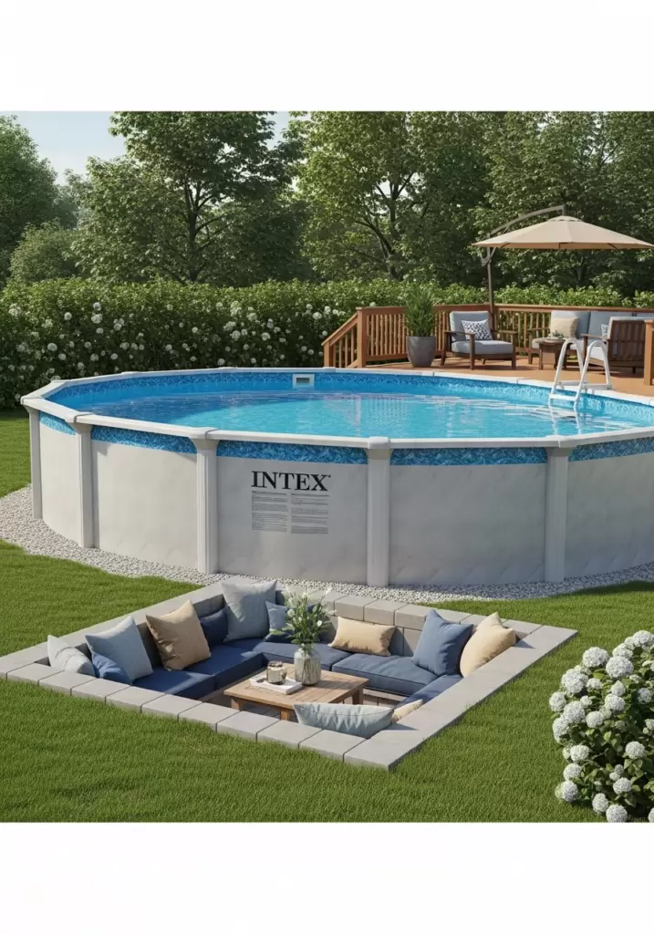 Design a slightly lowered seating pit with comfortable cushions next to your Intex pool. This creates a cozy, intimate social zone that feels luxurious and inviting.