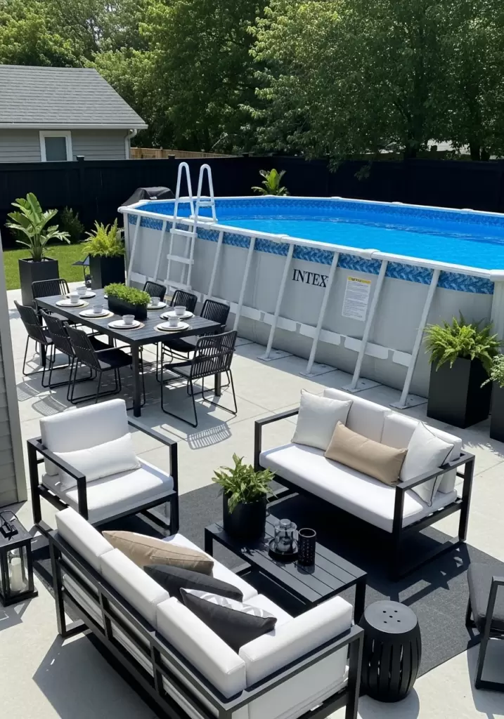 For a bold, contemporary look, use black accents, neutral cushions, and sleek furniture around your Intex pool. This creates a sophisticated and stylish outdoor space.